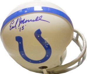 When regular Colts signal caller Johnny Unitas was injured in the final exhibition game, Earl Morrall became the team's starter. Morrall proceeded to lead the Colts to a 13-1 record, then added two playoff victories en route to winning the NFL's Most Valuable Player award, leading the Colts into Super Bowl III. Earl Morrall has hand autographed this Baltimore Colts Throwback 2 Bar Mini Helmet. Certificate of Authenticity from Athlon Sports..../ Earl Morrall signed Baltimore Colts Throwback 2bar Mini Helmet / mini bar